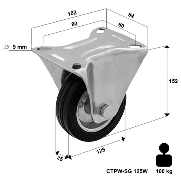 - WYPRZEDAŻ - Zestaw kołowy stały z kołem gumowym. Piasta metalowa z łożyskiem wałeczkowym.. Średnica koła 125 mm, nośność 100 kg. Wysokość całkowita 152 mm. Uniwersalne koło do szerokich zastosowań w wózkach warsztatowych, urządzeniach i maszynach.