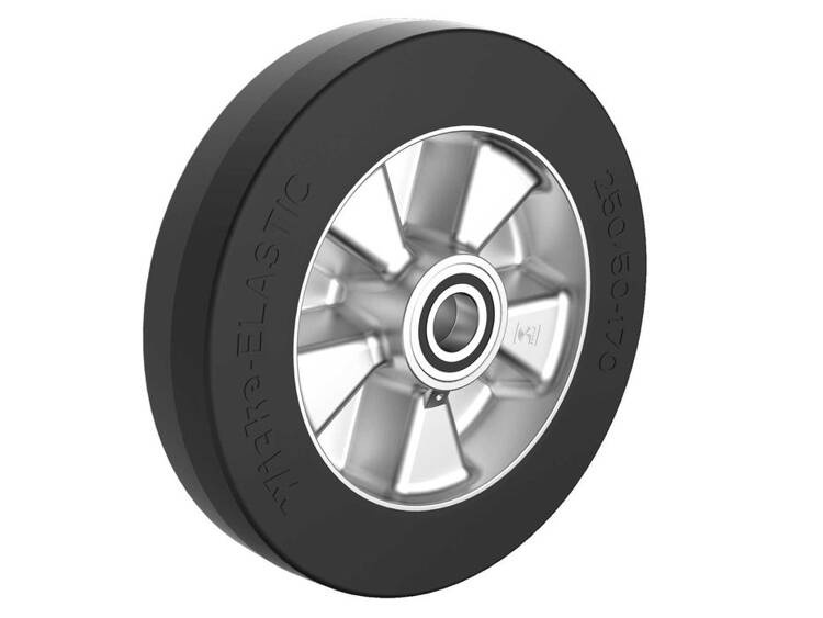 • Koło do pługa zamiatarki aluminiowo-gumowe - pełna guma - piasta ze stopu aluminium średnica 250mm z oponą z twardej gumy - nośność 525 kg - otwór w piaście 25mm / długość 60mm - podwójne łożysko. Do wózków gospodarczych i ogrodniczych.